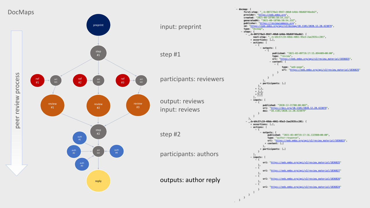 The DocMaps pilot is a collaborative effort between four open science infrastructure developers that seeks to support article evaluation models pioneered by groups like the Novel Coronavirus Research Compendium (NCRC), EMBO Press, Review Commons, eLife, and the MIT Press’s Rapid Reviews: COVID-19 (RR:C19) journal. It has adopted an agile approach to rapidly defining an initial use-case, prototyping a solution, testing it against real-world data, and iterating. The result is a working prototype of the framework that will go from idea to real-world execution in less than 6 months.
