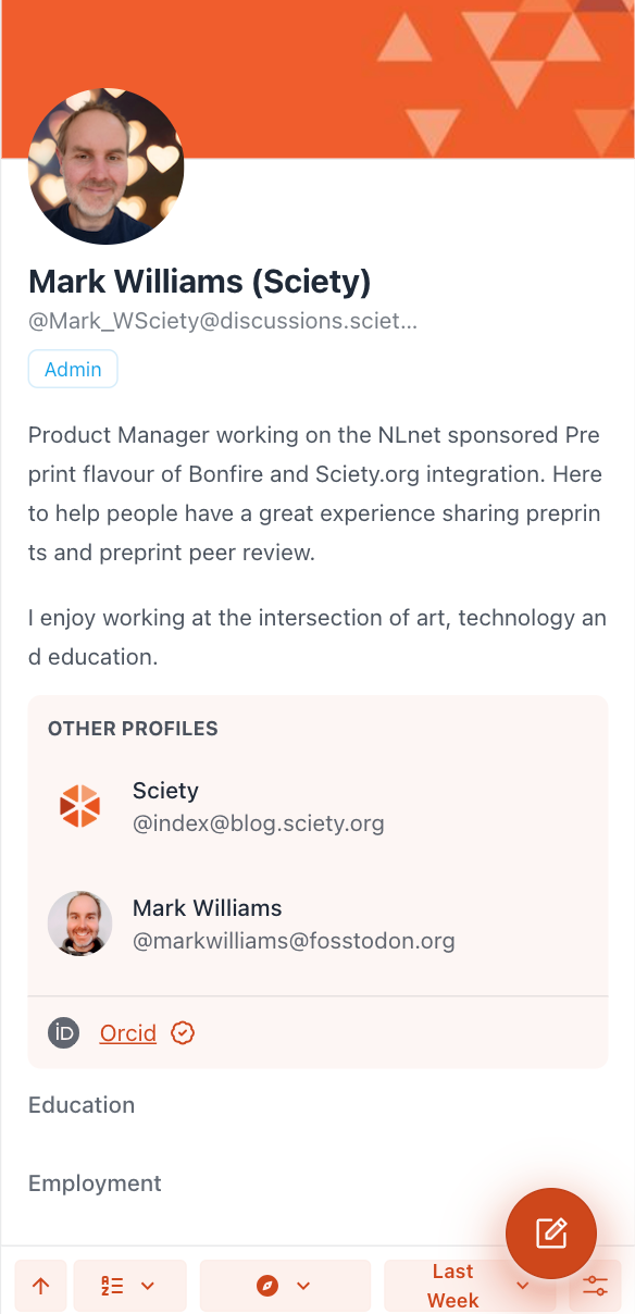 - When a new work is associated with your ORCID, it will be posted to the Fediverse. A useful feature for those that are involved in authoring papers and in peer review of preprints. For example, if you publicly associate your reviews with your ORCID profile through PREreview these could then be posted on Sciety Discussions and be added as part of the history of the preprint activity.