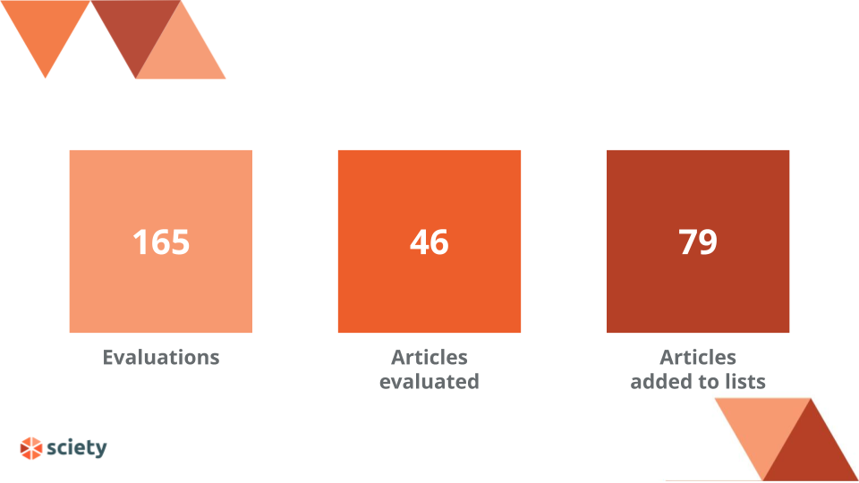 Some weekly stats you might find interesting and that use our new brand style. This is from Friday 13th - Friday 20th and details the number of evaluations added to Sciety, the articles that have been evaluated and the articles that have been added to lists.ā