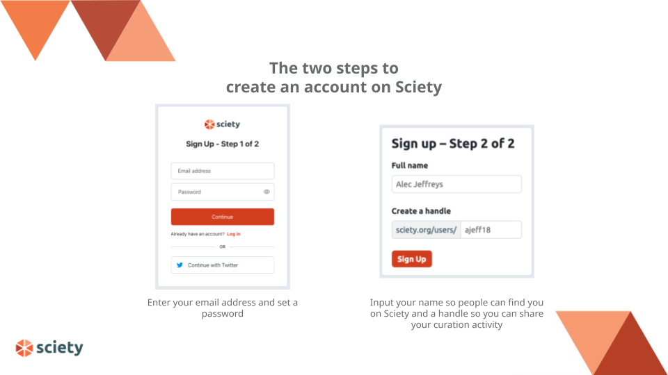 - Sign up to Sciety using your email and password. Up until this week, you had to use a Twitter account in order to save articles and manage your evaluated preprint article feed on Sciety. We heard from people across the globe that this represented a barrier to access both in terms of technology and geography. Adding the ability to login using a decentralised method like email address opens the doors to researchers worldwide to start their preprint discovery and curation journey today.